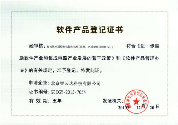 軟件產(chǎn)品登記證書——智云達(dá)水質(zhì)檢測(cè)儀操作軟件