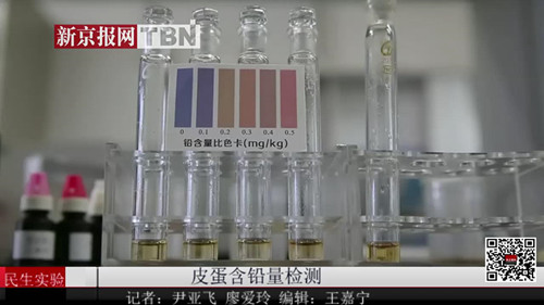 智云達(dá)技術(shù)工程師于勇首先挑選5種新京報記者從超市、菜市場、批發(fā)市場選購了來自不同產(chǎn)地包裝上標(biāo)注“無鉛工藝”字樣的皮蛋,其中還包括了一種鵪鶉皮蛋。把皮蛋剝殼,用剪刀剪碎,稱取2.5克,在提取瓶中加入10ml蒸餾水,用吸管攪勻,靜置10分鐘。10分鐘之后吸取上清液1ml到玻璃比色管中,然后在比色管中分別加入試劑一、試劑二、試劑三各一滴,然后蓋塞搖勻,靜置1分鐘。1分鐘后在比色管中分別加入10滴試劑四溶液,蓋塞搖勻后立即與比色卡比較。皮蛋里鉛含量越高,紅色就越深,如果不含鉛,則溶液就完全呈現(xiàn)藍(lán)色,比色管里的5種皮蛋溶液顯示出淺咖色。