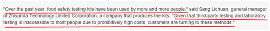 隨著中國食品安全事件的頻繁發(fā)生,越來越多的消費者通過購買食品安全快速檢測產品進行自我保護,這些產品可以檢測出食物中是否存在有害毒素、病原體和食品污染物。雖然專家們警告說這些快檢產品不能保證結果的絕對準確,但仍有很多消費者爭相購買。