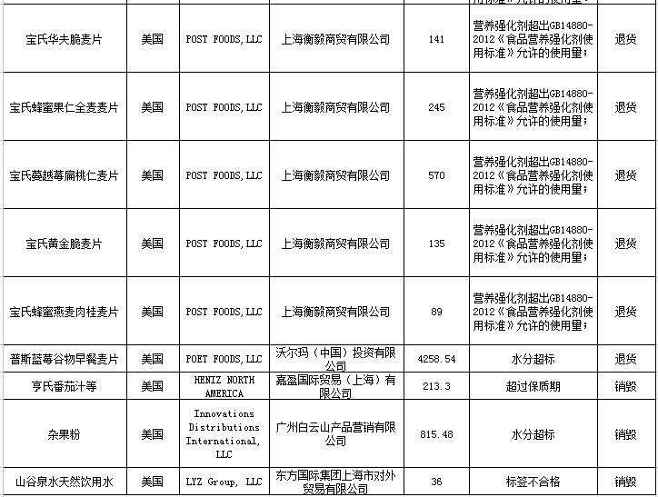 此外,對比名單還發現兩批次美國進境的APS牛初乳粉因鎘、亞硝酸鹽元素超標被檢出;“亨氏”番茄汁超出保質期被檢出;普斯藍莓谷物早餐麥片和雜果粉因水分超標被檢出;大西洋油鯡魚、大西洋鯡魚和山谷泉水天然飲用水因標簽不合格被檢出。