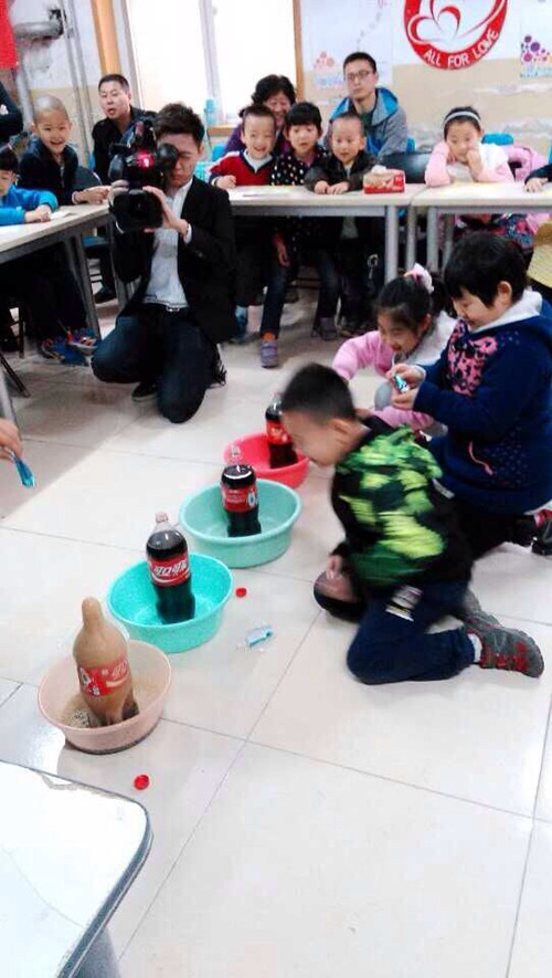 小朋友們?cè)诳蓸分蟹湃肓藥最w神秘物體,只見樂可瞬間噴射出來(lái),小朋友和家長(zhǎng)的驚呆了。