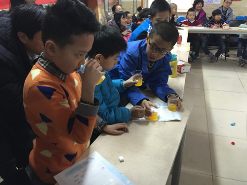 老師將事先調(diào)配好的果汁和從市場(chǎng)購(gòu)買的果汁讓家長(zhǎng)和小朋友們用感官來(lái)鑒別,猜錯(cuò)的還真不少。