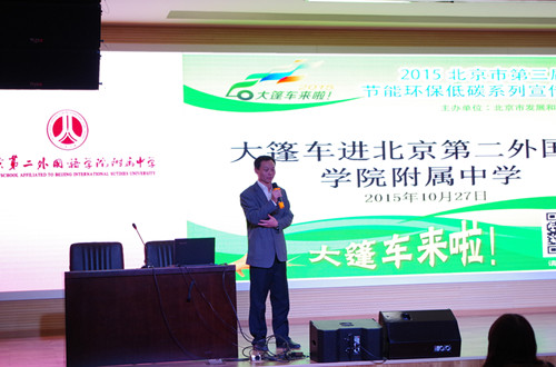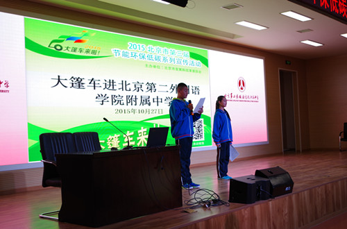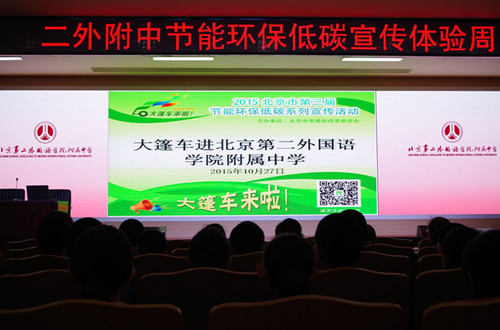 由北京市發(fā)展改革委員會(huì)主辦的2015北京市第三屆節(jié)能環(huán)保低碳系列宣傳活動(dòng)“低碳大篷車”于2015年10月27日走進(jìn)北京第二外國(guó)語(yǔ)學(xué)院附屬中學(xué)。