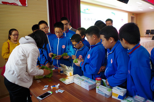 食品安全檢測(cè)消費(fèi)者體驗(yàn)中心的老師帶領(lǐng)同學(xué)們親自動(dòng)手體驗(yàn)蔬菜中農(nóng)藥殘留檢測(cè)