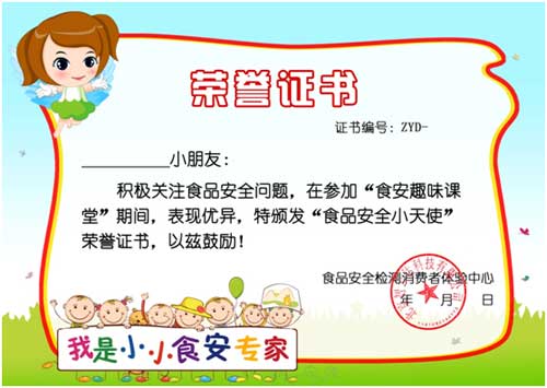活動結(jié)束后,我們體驗中心的老師還為參加活動的同學(xué)準(zhǔn)備了食安天使小證書。我們的趣味課堂不是要大家不要吃零食,遠(yuǎn)離帶有色彩的食品,而是讓大家知道這些食品中可能隱藏的健康危害,適量食用,最后同學(xué)們都收獲滿滿。