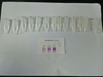 北京智云達(dá)技術(shù)工程師楊老師和王老師首先對(duì)不同樣品通過(guò)使用北京智云達(dá)自主研發(fā)生產(chǎn)的快速檢測(cè)產(chǎn)品:甲醛速測(cè)管,對(duì)泡椒鳳爪樣品進(jìn)行甲醛含量的檢測(cè)。