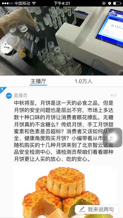 北京智云達本次與騰訊大燕網(wǎng)聯(lián)合直播,直播間為OMG!現(xiàn)在的月餅你還敢吃嗎?直播過程中在線人數(shù)突破一萬,并在持續(xù)增長中;直播過程中許多熱心網(wǎng)友進行提問,北京智云達技術人員都一一進行詳細解答。