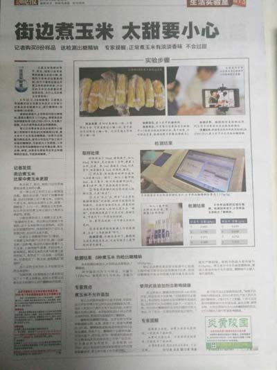 檢測結(jié)果:八個玉米樣品均含有糖精鈉,而國家標準中甜玉米是不得檢出糖精鈉,說明在外面購買甜玉米時很容易就會購買到含有糖精鈉的甜玉米,北京智云達提醒廣大消費者盡量少購買路邊攤甜玉米,最好選擇購買生玉米在家煮制,以保證食品的安全。