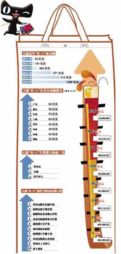 2016年的天貓“雙11”購物狂歡節(jié)已正式落下帷幕,全天總交易額達到了1207.49億元,其中無線交易額占比81.87%,交易覆蓋235個國家和地區(qū)。這是繼2015年912億元、2014年571億元之后,又一次刷新的成交額記錄。其他電商平臺如京東等,在此次“雙11”中也是戰(zhàn)績斐然,連創(chuàng)新高。