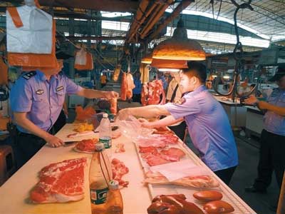執(zhí)法人員檢查肉檔的豬肉