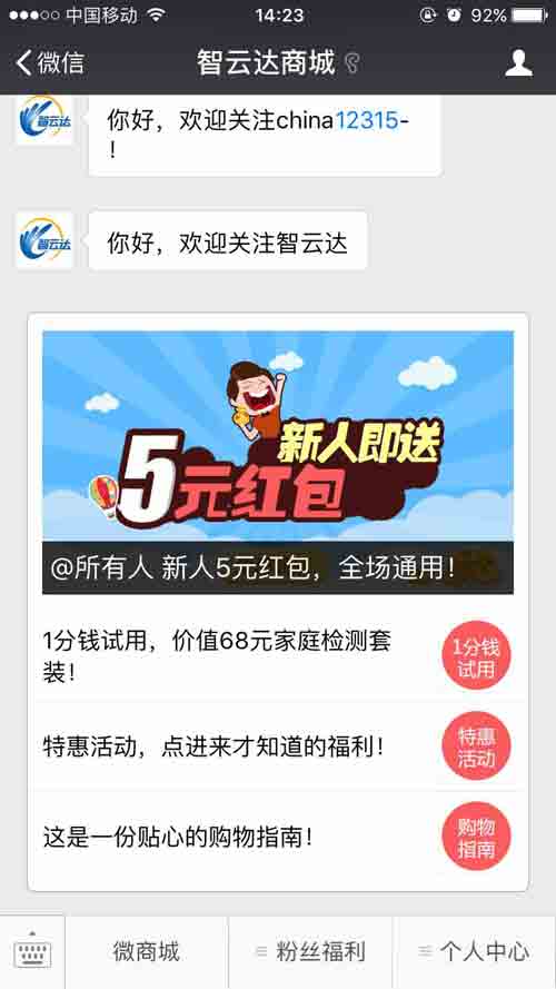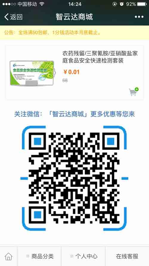 當(dāng)下微信人群活躍度高,微商城的開通為消費(fèi)者在隨時(shí)隨地選購食品安全快速檢測(cè)產(chǎn)品開通一條更為優(yōu)惠、方便的購物通道。那么如何在智云達(dá)商城購買產(chǎn)品?
