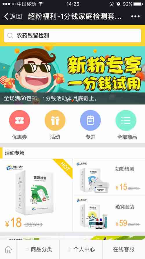 商城開業(yè)特推出一分錢試用活動(dòng),價(jià)值68元的食品安全家庭檢測(cè)套裝只要一分錢,一分錢能買到什么,你沒聽錯(cuò),可以檢測(cè)農(nóng)藥殘留、三聚氰胺、亞硝酸鹽,名額有限,檢測(cè)套裝帶回家。