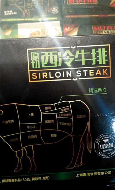 上海海灣食品有限公司生產(chǎn)的一款188g裝牛排產(chǎn)品,在配料表中注明添加了卡拉膠、谷氨酰胺轉氨酶等食品添加劑,但在產(chǎn)品包裝上卻冠以醒目的“原切菲力牛排”。另一款標稱為“原切西冷牛排”的產(chǎn)品,配料表顯示也添加了卡拉膠、黃原膠、三聚磷酸鈉等食品添加劑。兩款產(chǎn)品執(zhí)行標準均為《SB/T10379-2012速凍調(diào)制食品》。