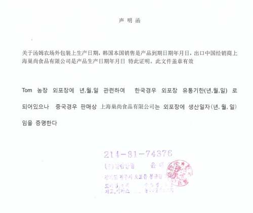 12月20日,1號店方面向澎湃新聞記者說明,韓國廠家確認(rèn)了國內(nèi)經(jīng)銷商的說法,出口巢尚食品的湯姆農(nóng)場產(chǎn)品外包裝所標(biāo)日期為生產(chǎn)日期,并出具了說明函。