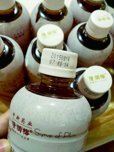 昨日,記者見(jiàn)到了葉女士購(gòu)買(mǎi)的這批過(guò)期酸梅湯,白色塑料包裝外標(biāo)有“中新藥業(yè)隆順榕牌梅味酸梅湯果味飲料”,每瓶?jī)艉?50克。瓶蓋側(cè)面所打印的生產(chǎn)日期顯示為2015年8月16日,而瓶體上注明的保質(zhì)期為12個(gè)月。照此計(jì)算,該飲料在2016年8月16日之后就已過(guò)期。記者從葉女士的購(gòu)物小票看到,購(gòu)物時(shí)間為2016年12月4日,也就是說(shuō),她購(gòu)買(mǎi)時(shí)過(guò)期已將近三個(gè)半月。