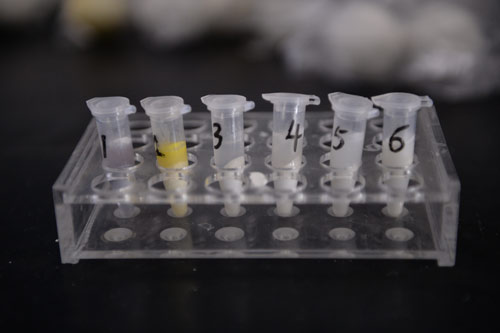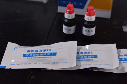 北京智云達技術工程師楊老師和王老師首先將樣品粉碎,通過使用北京智云達自主研發(fā)生產(chǎn)的快速檢測產(chǎn)品:黃曲霉毒素B1膠體金檢測卡,對樣品溶液進行檢測。