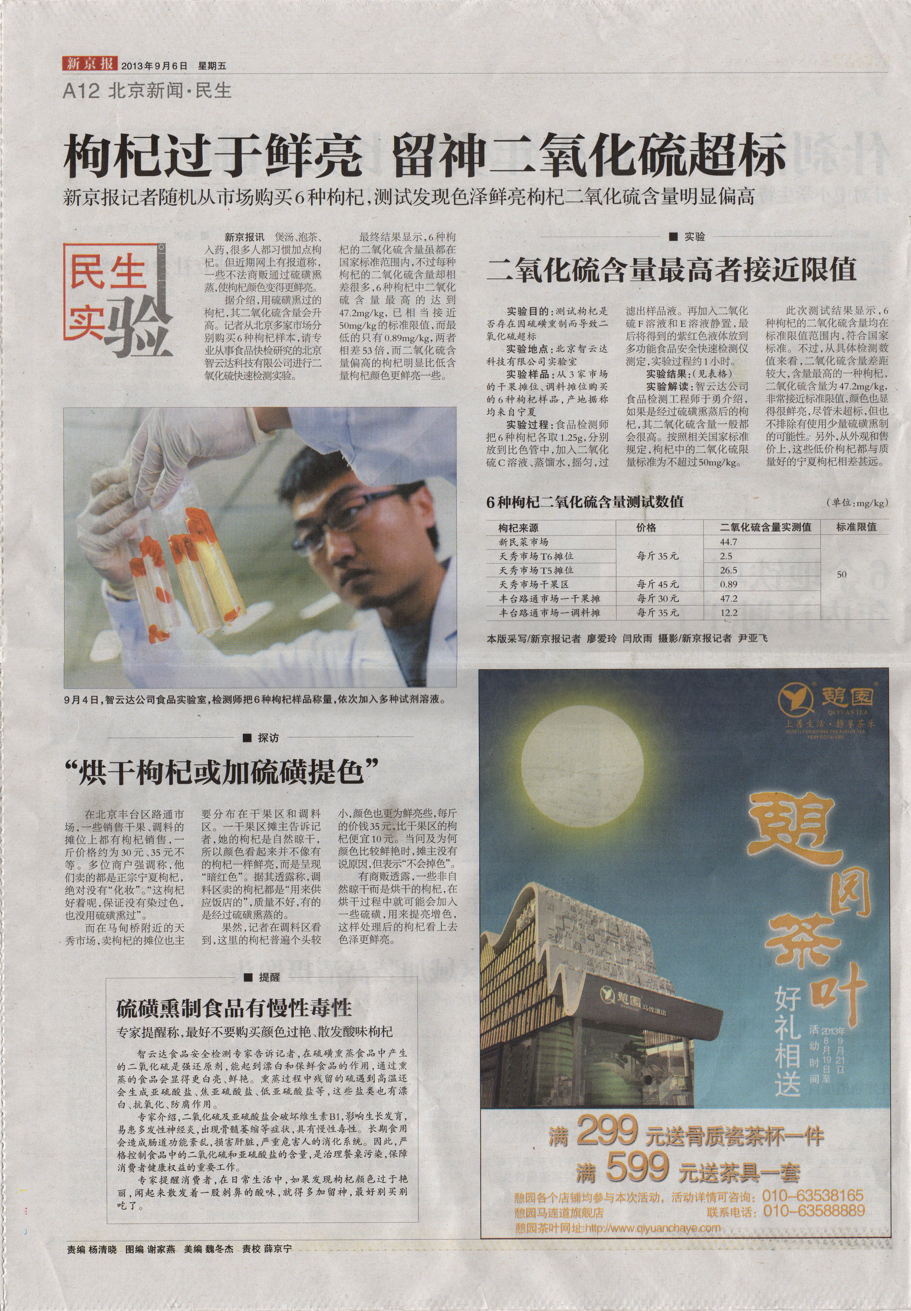 怎樣才能識(shí)別被美容的枸杞呢?新京報(bào)記者從北京多家市場(chǎng)分別購買6種枸杞樣本,請(qǐng)專業(yè)從事食品快檢研究的北京智云達(dá)科技有限公司進(jìn)行二氧化硫快速檢測(cè)實(shí)驗(yàn)。結(jié)果顯示,6種枸杞的二氧化硫含量雖都在國家標(biāo)準(zhǔn)范圍內(nèi),不過每種枸杞的二氧化硫含量卻相差很多,6種枸杞中二氧化硫含量最高的達(dá)到47.2mg/kg,已相當(dāng)接近50mg/kg的標(biāo)準(zhǔn)限值,而最低的只有0.89mg/kg,兩者相差53倍,而二氧化硫含量偏高的枸杞明顯比低含量枸杞顏色更鮮亮一些。