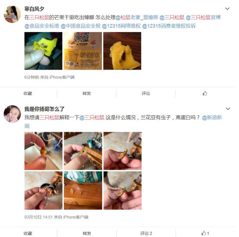 中新經(jīng)緯客戶端在微博上看到,不僅是劉洋和阿維,其他消費(fèi)者也表示曾在三只松鼠的產(chǎn)品中吃出過(guò)蟲(chóng)子。