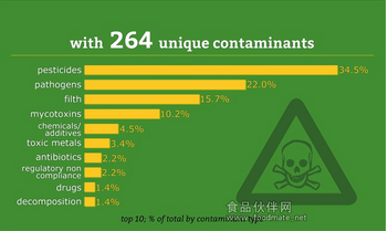 統(tǒng)計(jì)數(shù)據(jù)還顯示,出問(wèn)題的食品包括:海鮮(23.5%)、蔬菜(20%)、水果(13.8%)、香菜/調(diào)味品(8.9%)、乳品(7.5%)。食品違規(guī)類型包括農(nóng)殘(34.5%)、病菌(22.0%)、污物(15.7%)、真菌毒素(10.2%)、化學(xué)物質(zhì)/添加劑(4.5%)。