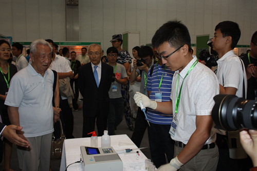 當(dāng)鄒家華首長來到展會的現(xiàn)場操作區(qū)時,智云達(dá)食品安全檢測工程師于勇的實驗吸引領(lǐng)導(dǎo)駐足觀看,隨后鄒家華首長對現(xiàn)場進(jìn)行的農(nóng)藥殘留實驗進(jìn)行了詳細(xì)的詢問,了解了食品快檢的工作原理及作用,提出了相關(guān)問題,并對目前的工作做出了指導(dǎo)。