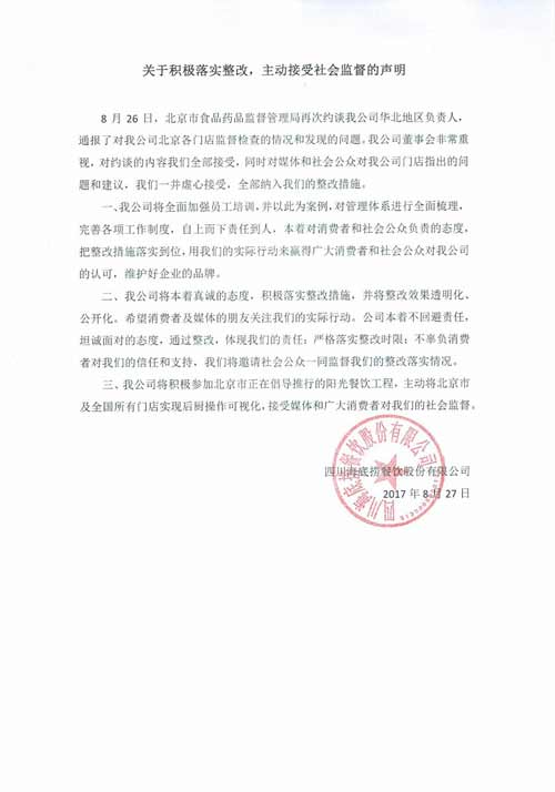 在后廚臟亂問(wèn)題被曝光后,8月25日下午,海底撈先后發(fā)布《關(guān)于海底撈火鍋北京勁松店、北京太陽(yáng)宮店事件的致歉信》、《關(guān)于海底撈火鍋北京勁松店、北京太陽(yáng)宮店事件處理通報(bào)》,承認(rèn)媒體披露的問(wèn)題屬實(shí),道歉并公布了整改措施。