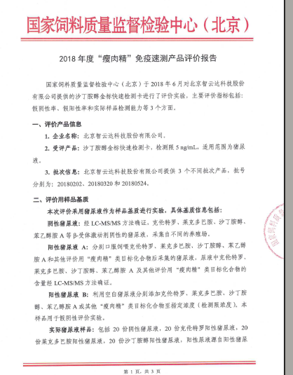 國家飼料質(zhì)量監(jiān)督檢驗中心(北京)組織開展的“瘦肉精”免疫速測產(chǎn)品評價工作的結(jié)果近日公布,智云達(dá)報送的克倫特羅、萊克多巴胺、沙丁胺醇三種免疫檢測卡的假陰性率、假陽性率、實際樣品檢測能力,均滿足評價指標(biāo)要求!