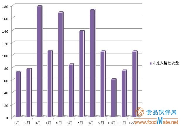 2018年共有1351批次超三千多噸食品檢出不符合我國法律法規(guī)和標(biāo)準而未準入境。每月未準入境的食品批次數(shù)量如圖所示,其中,3月、5月、8月檢出的不合格批次數(shù)量居多。