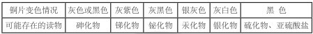 取樣品 5g 于三角燒瓶或蒸發(fā)皿中,加入 25ml 蒸餾水或純凈水,加入 5ml 鹽酸(如為水樣,取樣品 25ml,加鹽酸 5ml 即可),加入約 0.5g 氯化亞錫晶粒,將三角燒瓶放在電熱板上,調節(jié)溫控旋鈕使樣液微沸約 10 分鐘(驅除硫化物的干擾),此時加入 2 片銅片,保持微沸約 20 分鐘。注意隨時補加熱水,保持體積不變。若加熱 30 分鐘后銅片表面未變色,可否定砷、汞的存在,如銅片變色,可按下表推測樣品中可能存在的化合物,并可采取相應措施加以處理。保留陽性樣品,有條件時分別加以確證。