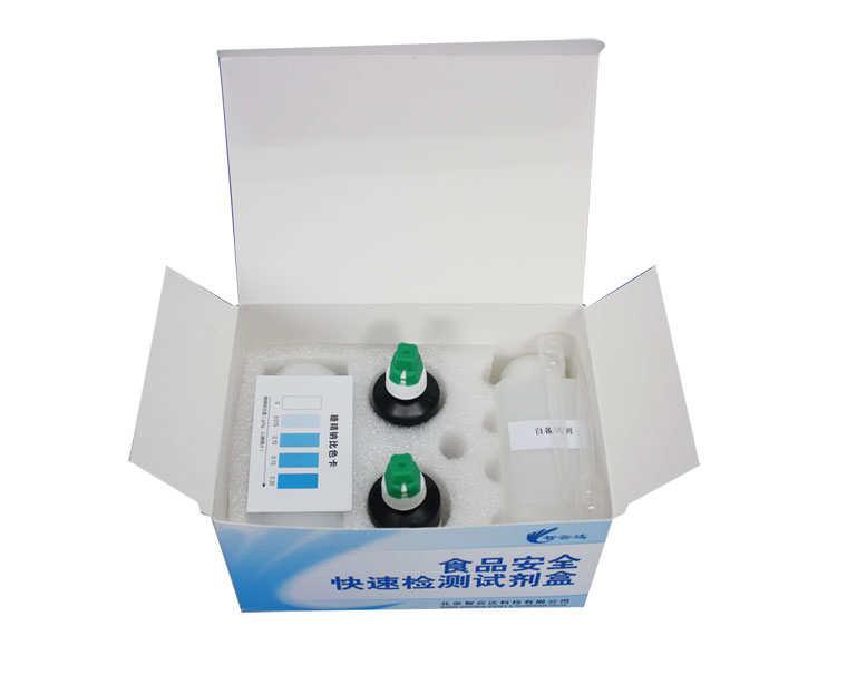 食品中的糖精鈉可與本試劑反應(yīng)生成藍(lán)色產(chǎn)物,顏色越深,表示樣品中糖精鈉的含量越高,與標(biāo)準(zhǔn)色卡比較,可以得出樣品中糖精鈉的半定量信息。