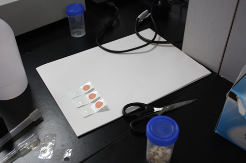 2、 取出農(nóng)藥殘留快速檢測卡,用滴管吸取2-3滴提取液,將提取液液滴加入到農(nóng)殘卡白色要片上。