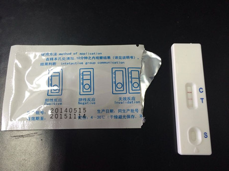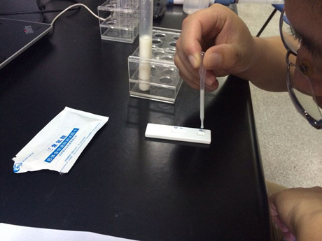 3、吸取待測樣品溶液,緩慢滴加80~100μl(約3~4滴)樣品液于加樣孔中,開始計時,在3~5分鐘內(nèi)讀取結果。