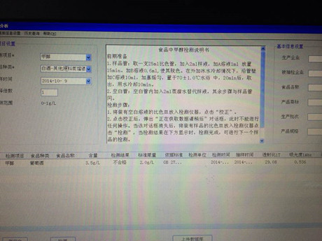 3、放入PCS食品安全快速檢測儀中檢測,檢測結(jié)果,甲醇含量為3.5g/L,大于國家標(biāo)準(zhǔn)400mg/L.