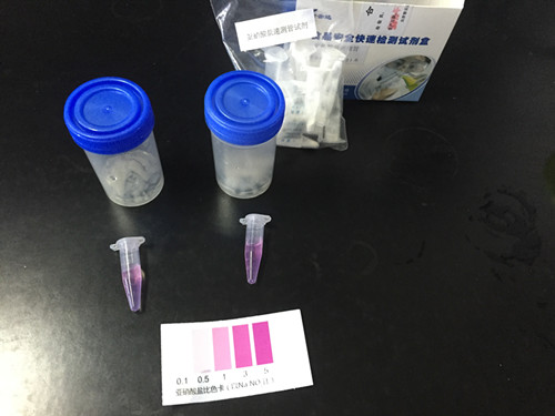 取上清液1.0ml加入到速測管中,蓋上蓋,將試劑搖溶,10分鐘后與標(biāo)準(zhǔn)比色卡對(duì)比,該比色卡上的數(shù)值乘上10即為樣品中亞硝酸鹽的含量mg/ kg;