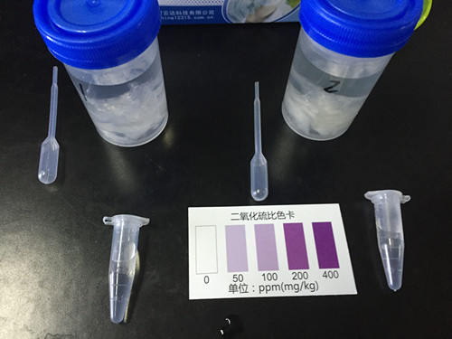 在1.5ml離心管中先滴加2滴檢測液A,1滴檢測液B,上下?lián)u動(dòng),混勻;然后加入1ml樣品液,立即蓋塞混勻。放臵5分鐘觀察顏色變化,并與色卡對(duì)照,得出樣品中二氧化硫或亞硫酸鹽是否超標(biāo)的信息。