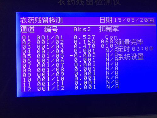 靜置時間結(jié)束后,立馬加入20ul底物并迅速轉(zhuǎn)移到農(nóng)殘檢測儀中進行檢測,通過3min檢測我們知道2號茶葉的酶抑制率超過50%,視為農(nóng)殘超標(biāo)。
