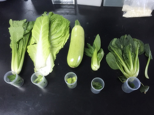 然后對(duì)所有蔬菜進(jìn)行取樣,各取2g表皮或者外層葉子(這些往往是噴灑農(nóng)藥接觸較多的地方);