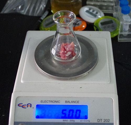 將樣品除去脂肪、骨及腱后,切碎攪勻,稱取5 g,置于樣品瓶中。