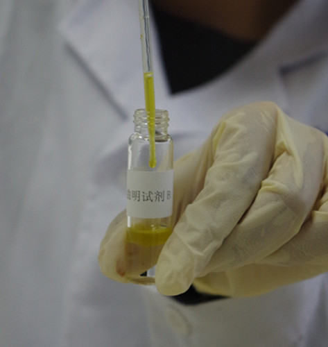 另取一支0.5 mL吸管,吸取試劑C至吸管細(xì)部前端約1/4處(約0.125 mL),插入至試劑B瓶的下層溶液中并緩慢排空,觀察B瓶下層溶液中是否產(chǎn)生渾濁絮狀物或沉淀物。