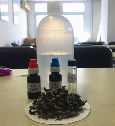 在離心管中,用移液槍依次加入4 mL緩沖液,20 μL顯色劑和50 μL酶,搖勻,靜置10 min。然后用移液槍加入20 μL底物。搖勻后立即轉(zhuǎn)移到比色皿中,放入儀器(通道1)。