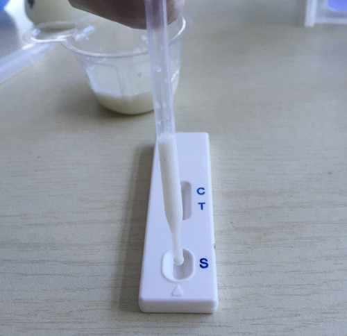 用干燥、潔凈的比色管盛放奶粉,用純凈水1:10稀釋(1份奶粉+10份純凈水),溶解后用于檢測(cè)。