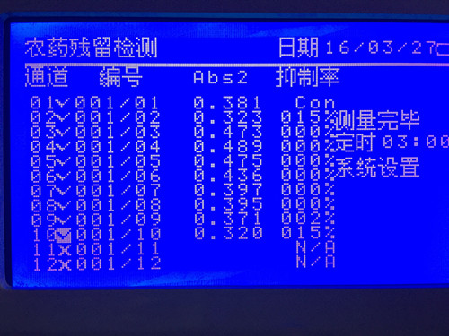 檢測結果如圖所示,結果以酶被抑制的程度,即抑制率表示。當果蔬樣品提取液對酶的抑制率為40~50%時,則表明被測樣品為可疑農(nóng)殘超標樣品;當抑制率≥50%時,表示蔬菜中有高劑量有機磷或氨基甲酸酯類農(nóng)藥存在,樣品為陽性結果。所以樣品中農(nóng)藥殘留符合國家標準。