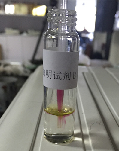 1 min后,B瓶下層溶液產(chǎn)生渾濁或沉淀,可判定含有西布曲明,即為陽(yáng)性(+);無(wú)沉淀則判為陰性(-);結(jié)果顯示樣品下層溶液澄清,初步判定不含有西布曲明。